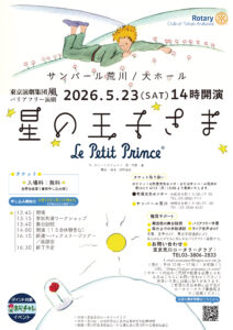 この度、私たち東京荒川ロータリークラブは人と人とが関わりあいが生まれる心の豊かさを感じられる場をつくりたいと考え、バリアフリー演劇プロジェクトを企画。荒川区、公益財団法人荒川区芸術文化振興財団との共催で東京演劇集団風「星の王子さま」を上演する運びとなりました。今回上演する作品は、アントワーヌ・ド・サン=テグジュペリによる1943年発表の作品で、子供から大人まで世代を超えて愛され続けている世界的な名作です。作中の「大切なことは、目にみえないんだ」というセリフのように、考えさせられることが、多くちりばめられています。世界中の「星の王子さま」にふれるひとたちにとって、人間が生きていくときに、何が大切なのかをこの作品が気づかせてくれると信じています。