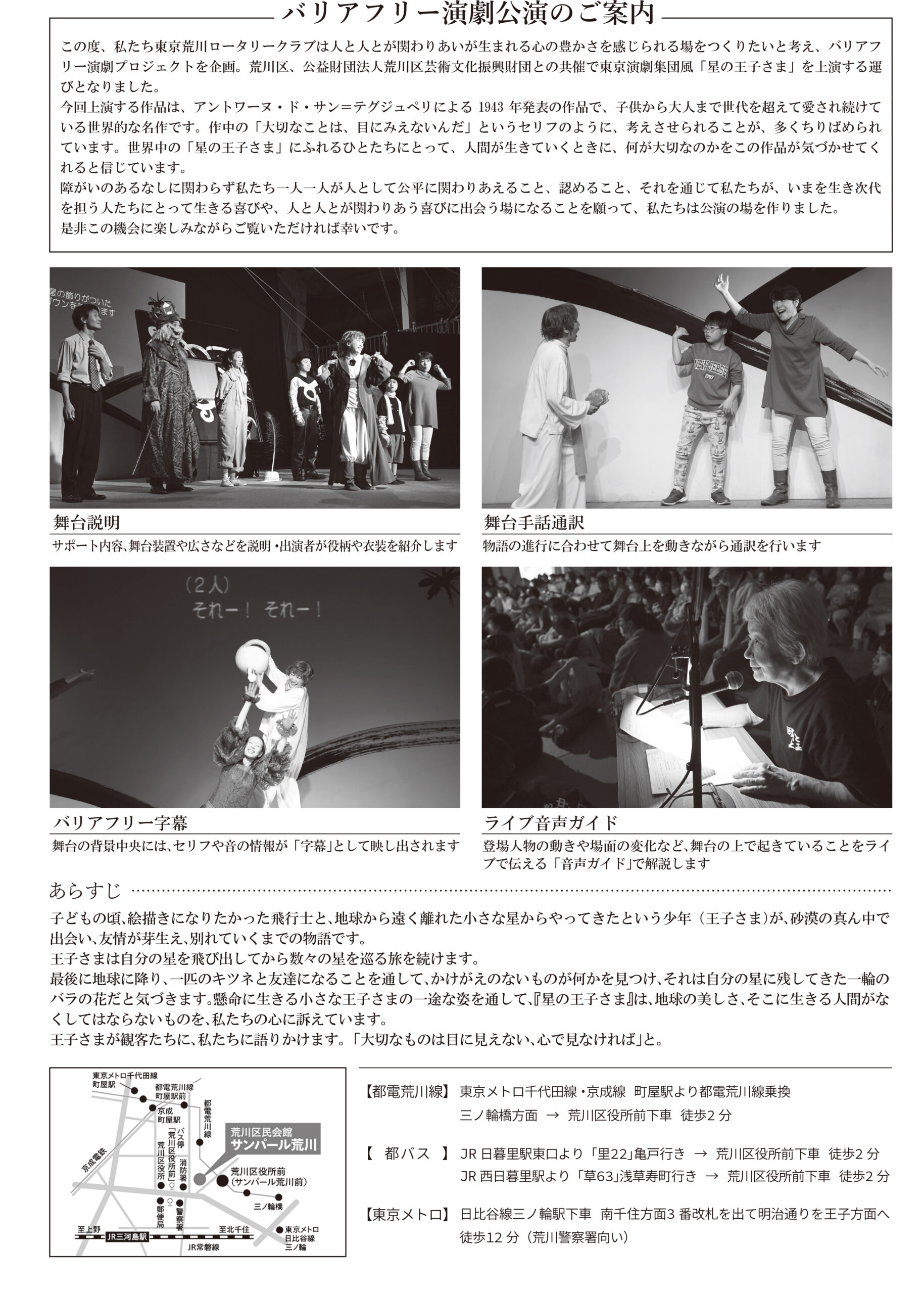 この度、私たち東京荒川ロータリークラブは人と人とが関わりあいが生まれる心の豊かさを感じられる場をつくりたいと考え、バリアフリー演劇プロジェクトを企画。荒川区、公益財団法人荒川区芸術文化振興財団との共催で東京演劇集団風「星の王子さま」を上演する運びとなりました。今回上演する作品は、アントワーヌ・ド・サン=テグジュペリによる1943年発表の作品で、子供から大人まで世代を超えて愛され続けている世界的な名作です。作中の「大切なことは、目にみえないんだ」というセリフのように、考えさせられることが、多くちりばめられています。世界中の「星の王子さま」にふれるひとたちにとって、人間が生きていくときに、何が大切なのかをこの作品が気づかせてくれると信じています。